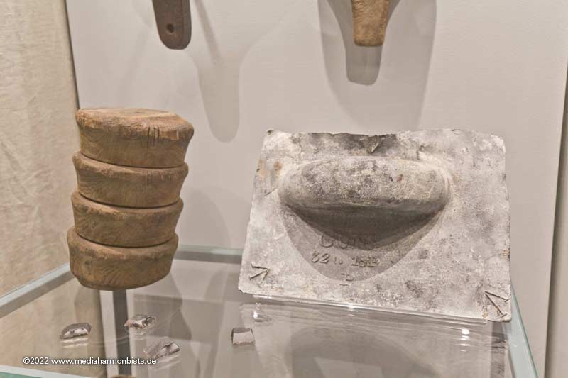 Die Farbigkeit der Bleiabdeckung habe ich den Artefakten aus Thorsminde angepasst. Auch die Löcher der Befestigung. Daraus ergibt sich auch die hintere Befestigung über den Ring, alle anderen Bindearten würden abrutschen. Die Farben der Tompions - Holz natur, weiß, rot - sind den Artefakten und Gemälden entnommen. Wahrscheinlich waren die holzfarbenen die am Meisten anzutreffenden, da die Tompions ja als 10er-Drehteil am Stück mitgeführt wurden und bei Bedarf einfach losgesägt wurden. Ob dann jedesmal gepönt wurde wage ich zu bezweifeln.